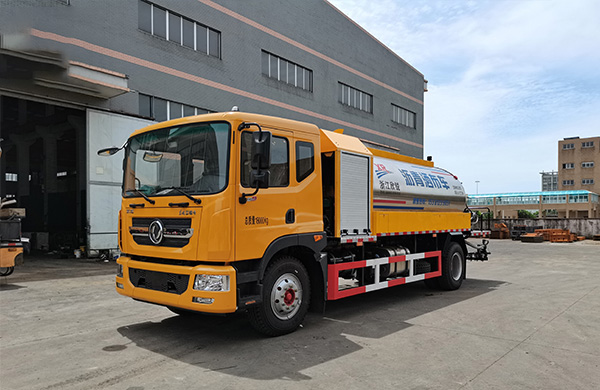 This vehicle is equipped with a Dongfeng D9 heavy-duty chassis, 9.00R20 steel wire tires, a wide-body double-layer frame, and has a strong weighing capacity. With a wheelbase of 3,950 meters and an overall length of 7.4 meters, it is convenient and flexible. The fully intelligent control system is equipped with a CPU and control module of Siemens brand and a touch screen of Taiwan Weilun. It can precisely control the amount of asphalt sprayed per square meter, freely switch between automatic control and manual control, and the spraying width can be controlled at will. The heat transfer oil system is configured to facilitate the removal of demulsified asphalt at the bottom of the asphalt tank, preventing people from climbing into the tank. When spraying hot asphalt, the heat loss in the pipeline is reduced through the circulation of heat transfer oil, ensuring a good spraying effect. Before each construction, by circulating the heat transfer oil, even if the asphalt pump is not cleaned at the end of the previous construction, the stuck asphalt pump can be dissolved. After the construction is completed, the oil can be returned to the tank with one click and the asphalt pump and spraying arm can be cleaned with one click to prepare for the next use.